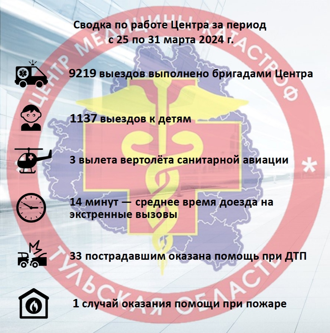 Центр медицины катастроф опубликовал статистику за период с 25 до 31 марта За прошедшую неделю тульские медики выезжали к пациентам более 9 тысяч раз.