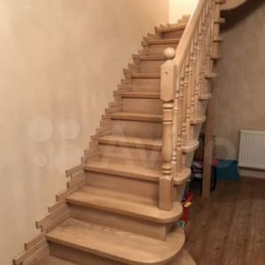 Лестница на второй этаж выполнена полностью из натурального выбеленного ясеня.