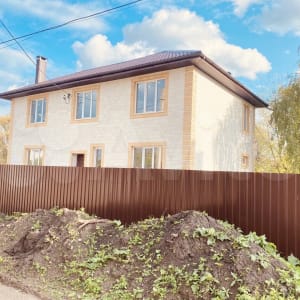 — Территория огорожена забором из металлопрофиля. Откатные ворота.