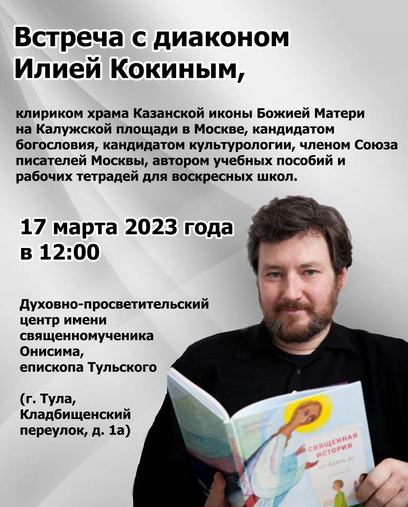 По благословению Высокопреосвященнейшего Алексия, митрополита Тульского и Ефремовского, в рамках Дня православной книги 17 марта 2023 года в 12:00 в стенах Духовно-просветительского центра им. сщмч. Онисима, еп. Тульского (г. Тула, Кладбищенский переулок, д. 1а) состоится встреча с диаконом Илией Кокиным, клириком храма Казанской иконы Божией Матери на Калужской площади в Москве, кандидатом богословия, кандидатом культурологии, членом Союза писателей Москвы, автором учебных пособий и рабочих тетрадей для воскресных школ.